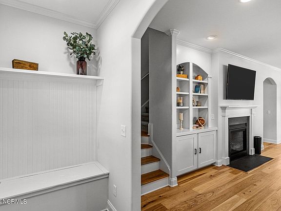 Welcome to your new home in Southport! This 4 bedroom cottage is filled with coastal charm and warmth from the beautiful light wood floors to the bright white built-in bookshelves, entry bench and plantation shutters. The sun-filled living room, dining room and kitchen provide a wonderful setting for entertaining. The kitchen is tastefully decorated with white cabinets, subway tile backsplash, granite countertops, soft close cabinet doors, and under cabinet lighting. The primary suite is on the first floor and offers a soaking tub, zero entry shower, water closet and a walk-in closet. Just down the hall from the primary suite is a half bathroom and the laundry room with entry to the garage. Continuing to the second floor you will find 3 additional bedrooms, a full bathroom, an office and two large walk in storage rooms. The entertaining doesn't stop inside, you can enjoy warm summer mornings or cool fall evenings on the spacious covered porch and fenced in yard. Don't miss your chance to call this coastal cottage your home. Call to schedule a tour today!
