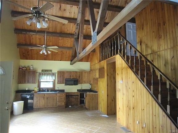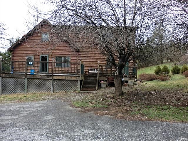 Unique Log Home on 1.5 acres with lots of privacy. Large porch faces gorgeous views. Over sized living room has beautiful stone fireplace. Master bedroom, sitting room, walk-in closet and full bath are located on the second floor. Second staircase leads to second bedroom with vaulted ceiling and exposed beams. Additional bedroom and full bath are on main floor. Large 2-story eat-in-kitchen with vaulted ceiling and exposed beams. Full walk out basement includes family room, storage and laundry room.