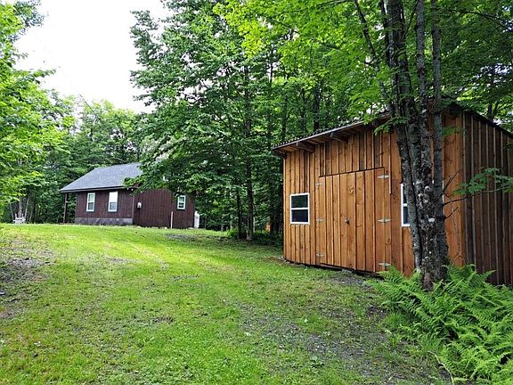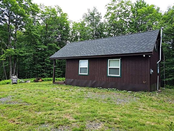 Tucked in so you see no one and no one sees you, come check out this cute camp! Nice views from the property since the land has had some clearing. Smaller cottage constructed in 2012. Adorable inside finished with pine & high cathedral ceiling. Main living space is an open area with recent finished kitchen. One bedroom plus small loft for extra sleeping space and/or storage. Brand new wall propane heater. Water is a catch rain cistern pumped inside. The bathroom is not complete but has toilet. Electricity at the property and Netafy internet available. Covered porch is perfect for relaxing overlooking distant mountain views. Good size storage shed to put things away. Yard has good space for parking. Lots of pretty hardwood trees. A large area of conservation land abuts this property. You can snowmobile from here, hunt, and drive to the Pittsburg lakes only 15 minutes away. Come get-away and relax!