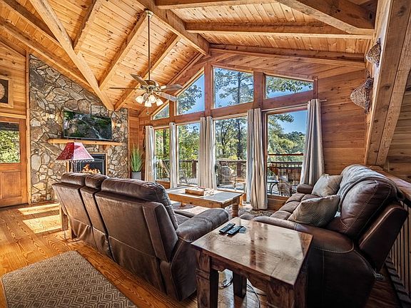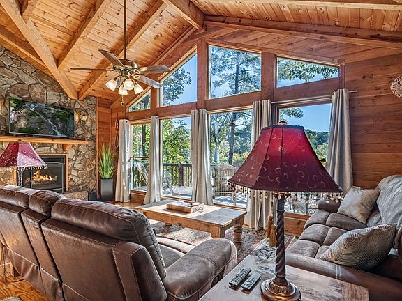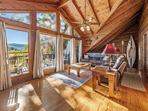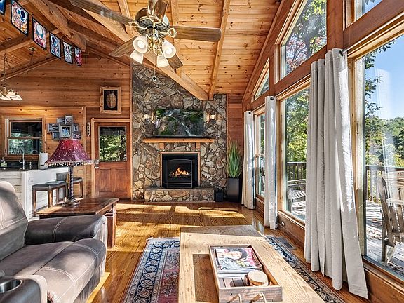 Welcome to your affordable retreat, where mountain living meets the breathtaking beauty of the Blue Ridge Mountains. This exceptional cabin not only boasts a stellar rental history but also offers long-range mountain views that can be enjoyed from the hot tub and nearly every room in the house, providing a serene backdrop for both relaxation and entertainment. Tucked away in a peaceful and private setting, this home features two spacious primary suites, ensuring that you and your guests can unwind in comfort. One of the suites is accented by its own charming fireplace, creating an inviting atmosphere perfect for cozy evenings. The thoughtfully designed layout includes a separate den, allowing for additional space to relax or engage in conversation away from the main living areas. Step outside to experience the natural beauty of the mountains from three screened porches—ideal for sipping morning coffee or enjoying evening sunsets without the worry of bugs. The expansive deck invites outdoor gatherings, where you can soak up the stunning landscape and create lasting memories with family and friends. The cabin comfortably accommodates up to six guests, making it a fantastic option for rental income or lazy getaways. The large fixed glass window in the great room frames the breathtaking views, bringing the outdoors in and filling the interior with natural light. The seller has diligently maintained and updated this cabin to meet today's mountain standards, blending modern amenities with rustic charm.