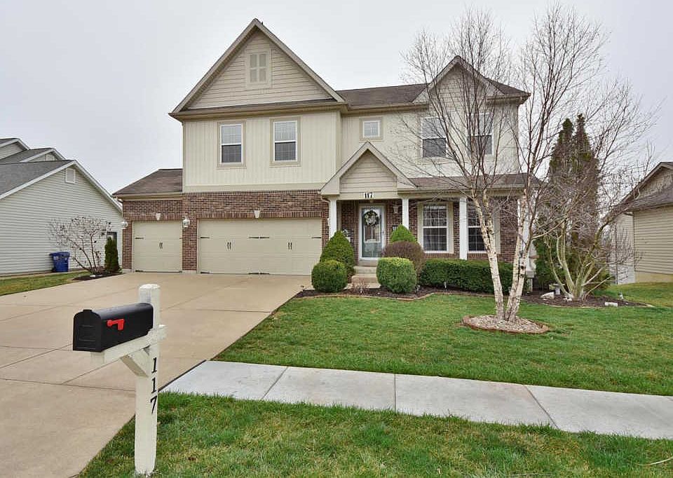 This massive 4 bed/3.5 bath brick-front 2-story residence is just what you've been searching for & more! A charming covered front porch welcomes you home & into the formal entry foyer where French double doors lead to the den. Stretch out in the spacious great room w/a toasty marble surrounded fireplace. Entertain in style w/the formal dining room + inviting eat-in kitchen & adjacent breakfast room boasting ample 42in custom cabinetry, stone tile backsplash, gleaming granite counters, center island, walk-in pantry & sliding glass doors to the elevated deck, large patio & fenced-in yard. Main floor laundry & powder room. The expansive upper level includes a large loft/sitting room + a divided bedroom floorplan w/an oversized master suite boasting private full bath w/double vanity, oval lounging tub, walk-in shower & 10x9 walk-in closet. The finished walk-out LL adds a huge family room, rec room, bonus and doggy room. Huge 3-car garage! New Wentzville Middle & High School Boundary!