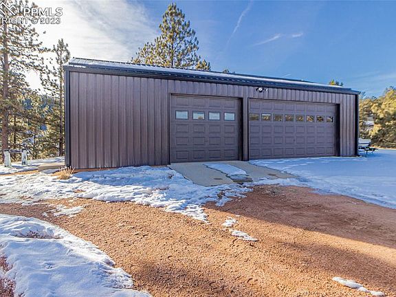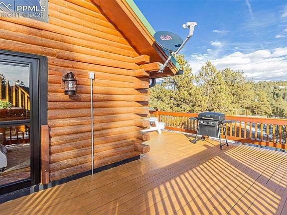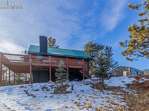 Welcome home to your Colorado Rockies Retreat! Charming D-log home with a 960 sq ft detached Garage are nestled on 2+ acres of picturesque landscape near the historic town of Cripple Creek. Enjoy the ambiance of this true log home with its warm, rich colors, 2 fireplaces, vaulted ceilings, an open Loft, and beautiful natural lighting coming through the picture windows. Luxury vinyl wood-look flooring enhances the mountain style while providing durability and easy maintenance. The main level hosts Kitchen, Living Room, two cozy Bedrooms and full Bath. The heart of the home is the moss rock fireplace and hearth…you’ll just love relaxing in front of it! The versatile Loft space creates a sense of spaciousness, ideal for use as an Office or Hobby Room. The lower level features a large walkout Family room with a woodstove, creating the perfect retreat for gatherings or quiet evenings. There is a large Laundry room and Bonus Room in lower level, too. Step outside onto the expansive 400+ sq ft wraparound deck, where beautiful views of Mt. Pisgah and the foothills of Pikes Peak await, providing the perfect backdrop for outdoor entertainment or peaceful solitude. Another highlight of this property is the spacious 960 sq ft insulated 3-car garage with workshop and storage space. There is a circular driveway to the house and another drive to the garage, both with parking pads and plenty of space to turn around. Cripple Creek Mountain Estates is a desirable neighborhood with clubhouse, disc golf, tennis courts, swimming pool, and fitness center. With its ideal blend of mountain charm, modern comfort, and convenient location just of Teller County Rd 1, this inviting log home is a haven in the heart of nature. Come see for yourself…you’ll never want to leave!