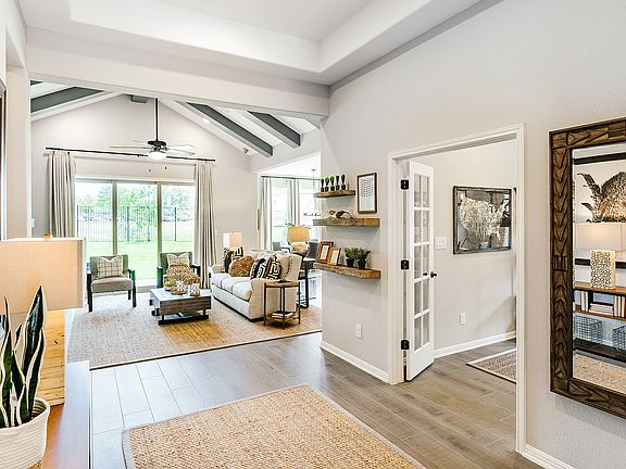 Our model home “The Bowman” is a large single-story home with an open living family room that boasts a cathedral ceiling with decorative wood beams, a tile front wood burning gas start fireplace and a 9ft sliding glass “wall of windows” that opens to a large rear patio. The primary suite includes an oversized bedroom with 11ft ceilings and a formal bath with his & her vanities, separate shower with seat, garden tub and large closet. Other features include a garage entrance with drop station cabinets, half bath and large utility room, an extended study with private bath, a “pocket office” with built-in desk, secondary bedrooms with Jack & Jill bath and barn door at the hallway for added privacy and many other designer touches throughout as well as a super low 1.96% tax rate!