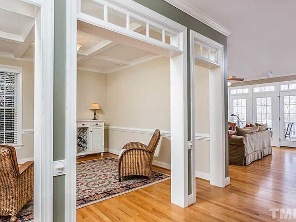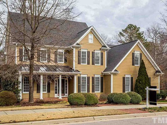 Custom Home in Cary Park w 5 bedrooms or 4 bedrooms and a bonus. Foyer opens to living room or office and dining room. Hardwoods and 11ft Ceilings throughout main floor. Large eat in gourmet kitchen w upgraded SS appliances, island and breakfast area opening to family room warmed by fireplace. New carpet! Screened porch, deck overlooking private wooded backyard. Master suite w separate garden tub and shower. 3 car garage. Walk up attic w almost 700 more sq ft that can be finished. Comm Pool and clubhouse!