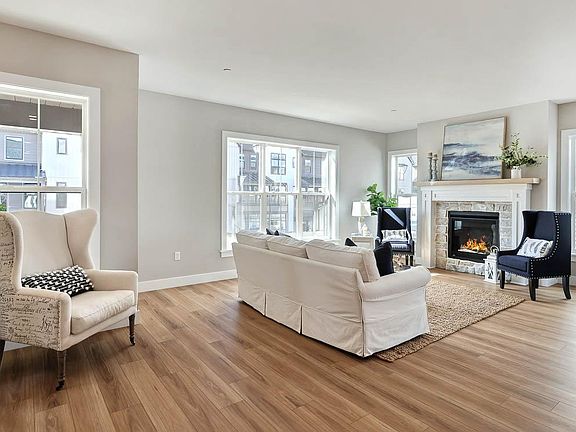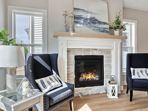 This 2-story, end-of-row townhome includes a first-floor owner’s suite, 2-car, rear load garage and a mudroom entry with built-in lockers and bench. Stylish vinyl plank flooring flows throughout the main living areas. The living room, warmed by a gas fireplace with stone surround, opens to the kitchen and dining area with sliding glass door access to a patio. The kitchen is well-appointed with stainless steel appliances, quartz countertops with tile backsplash, and large center island. The owner’s suite, tucked quietly to the back of the home, features an expansive closet and a private bathroom with tile shower and double bowl vanity. A laundry room is conveniently located across the hall from the suite. On the 2nd floor is a loft, two additional bedrooms, and a full bathroom.