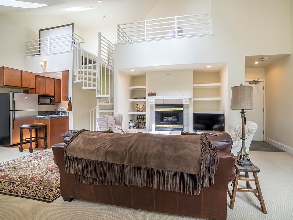 This one bedroom, two bath condo is located in a dog friendly complex just steps to multiple ski lifts, shopping, dining, biking, and hiking. Natural light floods the unit with multiple skylights and great southern exposure. A lofted bedroom, with en-suite bath and sitting area, creates separation from an ample living space complete with fireplace. The spacious private patio basks in sunlight and provides big Wilson Peaks views to the West. Ski locker and a deeded parking space are just an elevator ride away. Quarterly HOA dues include electric, gas, water, and cable.