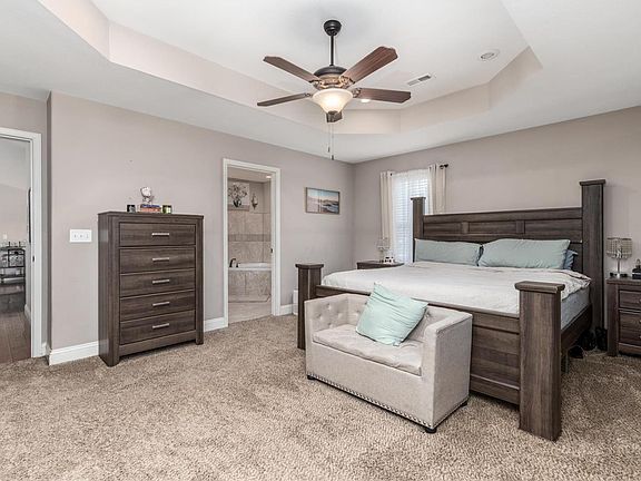 The master suite is a true retreat with a bedroom with a trey ceiling, recessed lights, and a ceiling fan. The walk-in closet offers plenty of space, while the attached bath feels like a spa with its corner-tiled jetted tub, double vanity, large separate shower, and convenient linen closet. Escape the hustle and bustle in the privacy-fenced backyard, where you can unwind on the wood patio with your favorite drink.