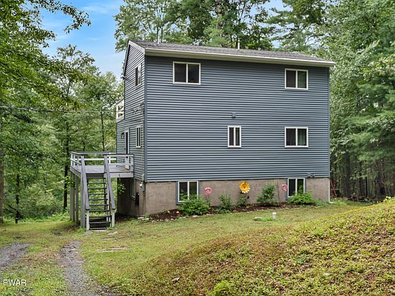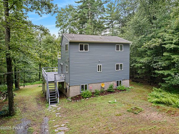 You have been waiting for this charming Saltbox Sanctuary on 2 Acres in Pocono Mountain Water Forest. This is an enchanting 3 bedroom, 2 full bathroom raised saltbox with a wrap-around deck and a balcony off the primary bedroom. Morning coffee on the deck will feel like you're in a treehouse! Enjoy a very private and quiet setting, perfect for unwinding and connecting with nature. This home has been thoughtfully updated with new siding, new gutters, and new downspouts, ensuring peace of mind for years to come. Inside, the pellet stove in the living room provides a cozy and efficient heat source on chilly evenings.The practical layout features a bedroom on the first floor, with the primary and an additional bedroom on the second floor. A full basement with a walkout to the backyard offers potential for a workshop, additional living space, or simply extra storage. Experience the perfect blend of country charm and modern updates in this unique home. It's an ideal retreat for those seeking privacy without sacrificing convenience.
