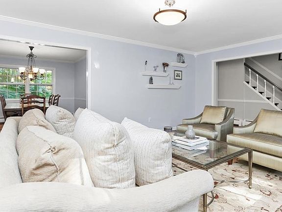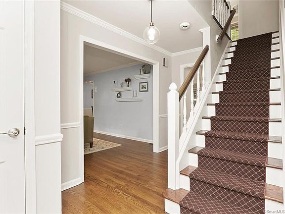 Tucked away on a quiet street surrounded by an acre of towering trees, lush foliage, and professionally landscaped outdoor space, this four-bedroom, three-bath New England Colonial-style family home gives you a rustic foothold in Stamford. A massive, 550-square-foot two-car garage opens into a large family room with a gorgeous white brick fireplace and elegant recessed lighting, as well as an adjacent bathroom and a sun room facing the yard and back deck. Stunning hardwood floors run throughout the spacious living and dining room, both of which offer plenty of natural light and room for entertaining. The eat-in kitchen, meanwhile, boasts gorgeous white cabinetry, classic stainless steel appliances, and plenty of room for a breakfast nook. Upstairs, you'll find three guest bedrooms and a guest bath, all with plenty of closet space, as well as a huge master bedroom with its own private bath. On the lower level, the home also takes in a utility room that can easily be converted into a workshop, as well as a crawl space for additional storage. And while it may feel isolated, the property is just a short walk from local favorites like LaRocca's Country Market and Long Ridge Tavern, and convenient to local attractions like Rockrimmon Country Club.