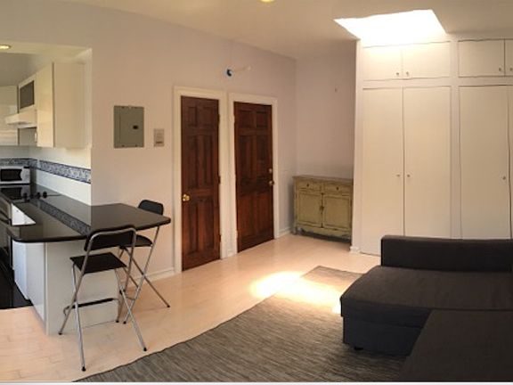 Partially furnished Studio conveniently located on beautiful historic street in Greenpoint Brooklyn. Only a block an a half away from Greenpoint stop on G train. - Granite countertops, hardwood flooring, two skylights and spacious closets. - 3 windows facing backyard bring in lots of afternoon sunlight. - Recessed ceiling lighting with dimmers. - Wall bracket ready for flatscreen TV. - Partially furnished with convertible sofa, counter stools, rug, mirror, floor lamp, and some kitchen amenities. - Stainless steel electric range with oven, microwave, and under the counter refrigerator. - Beautifully tiled bathroom with glass enclosed shower. - Safe quiet building. - Credit check is required. - Seeking to rent out to a single professional individual. - Heat & hot water are included. Owner pays for heat and Hot Water. Renter responsible for Electric. Credit Check and references required. - Seeking to rent out to a single professional individual.
