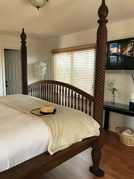 Penthouse apartment with spectacular views of the ocean and treetops and the lights of Long Island. King size four poster Balinese bed. Seating area with two armchairs and a coffee table. Bathroom with twin handbasins, a jacuzzi and shower and views. Small fridge and microwave. Fall asleep with the sound of the ocean, wake up to birdsong. Large (760 sq ft) rooftop deck with lounge chairs and armchairs with table. Large landscaped garden with table and chairs. Deeded access to two privare beaches. For daily and weekly rentals all utilities are included