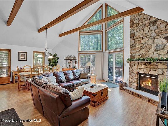 Discover the charm of secluded living in this delightful chalet-style home for sale at 117 N Lehigh River Dr, Clifton Township, PA. Nestled in the tranquil Big Bass Lake community, this property offers a peaceful retreat with all the comforts of modern living.This beautiful home features 3 bedrooms and 2.5 bathrooms across 1560 square feet of living space, boasting possible additional sleeping accommodations in a versatile loft area. The interior is highlighted by cathedral beamed ceilings that create an expansive feel, complemented by durable laminate flooring and an open floor plan that invites seamless flow throughout the living spaces.Central to the home's cozy ambiance is a stone propane fireplace, perfect for gathering around during cooler evenings. The large deck extends the living space outdoors, ideal for entertaining or simply enjoying the serene surroundings.Included in the sale are all furnishings, making this a fantastic turn-key opportunity for those looking to move right in without the hassle of furnishing a new home. The property is situated close to the community outdoor pool and the Big Bass Lake Community Association, adding to the appeal with amenities that enhance both the leisure and value of your investment.Whether looking for a year-round residence or a vacation getaway, this property is also friendly to short-term rentals, offering flexible options for usage.Experience the blend of privacy, comfort, and convenience in this enchanting chalet, ready to become your new home or investment opportunity.