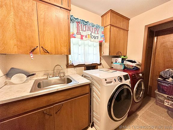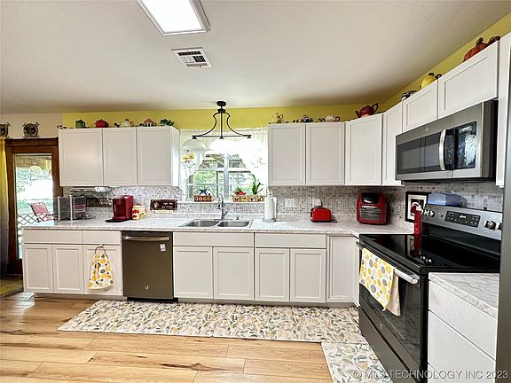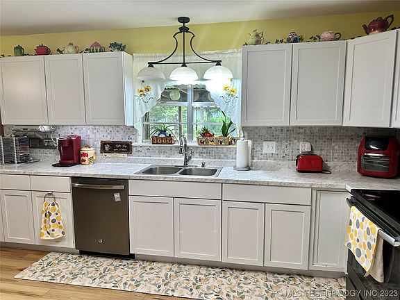 Home Sweet Home! Private & Quiet area Brick/Cedar Home in Dewey. Property has 4 lots, Country feel in town! Beautiful flower beds & mature trees. Newly remodeled Kitchen! Metal Roof, lots of storage, Oversized 2 Car Garage w/Carport, Shed and outbuilding. New laminate flooring in living room, dining, and kitchen! This home sits on .85 of an acre. 3rd bedroom used as office currently. Hobby room could be converted to 4th bedroom!