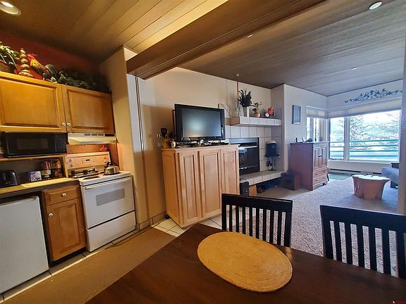 Comfort and convenience in an all-seasons condo. This popular third floor Eolus studio offers easy access, covered/assigned parking, ski slope and mountain views. It’s just steps (literally stairs) from the chairlift and main Village base area. First (ground) level of the building is where the parking (1 designated spot) is located and elevator access. Included is an assigned ski locker, also on 3rd floor, which is the first residential floor. The unit has an airlock entry with coat closet, efficiency kitchen with range/oven, additional refrigerator, stacked washer dryer, full bath with single sink vanity and closet. The flex dining space has table that will fold into a queen bed. There is also a queen futon for additional sleeping, wood burning fireplace and direct access onto large balcony with private seating in front of unit. Eolus has on-site management and several amenities including hot tub(s), and is also part of the Durango Mountain Master Association (DMMA) providing owners and guests with access to all the amenities located just across the Plaza at Purgatory Lodge including: fitness center, private Club lounge, game room, outdoor heated pool, hot tub and tennis courts. Seller has owned since 2015 and not participated in any rental program. It’s been enjoyed by family and friends exclusively – however, would be ideal for a STR with rental income potential.