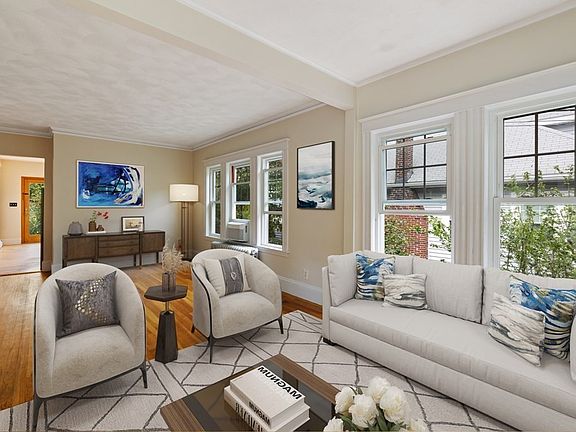 Delightful and bright bungalow in Brackett School with two car garage in amazing neighborhood. This three plus bedroom home has an oversized living room with lots of windows for letting in the sunlight along with a wall of shelving. Cute front porch to while away the evenings. Open kitchen with room for a table and lots of storage. French door leads to delightful backyard with patio and deck along with garden area. Use the flexible floor plan on the first floor for your personal needs, family room or dining room or home office - your choice and you can choose two! First floor is hardwood. Upstairs three spacious bedrooms and a full bath. All of this and you are moments away from elementary, middle and high school, as well as the downtown. Easy access to highways and a hop away from Menotomy Rocks Park - a neighborhood favorite. Bring some ideas for a few cosmetic improvements and have a house for generations.
