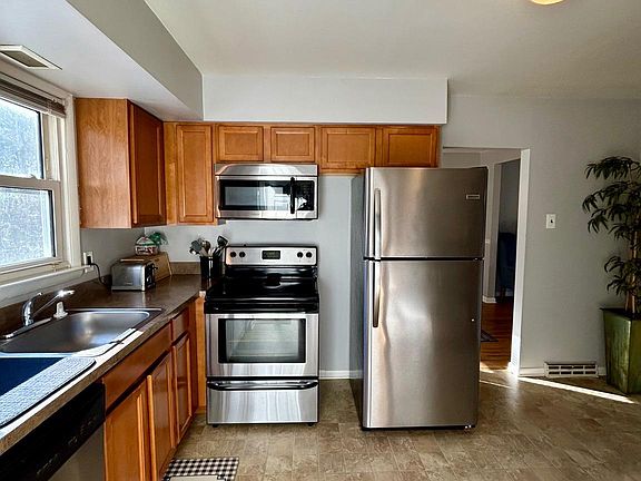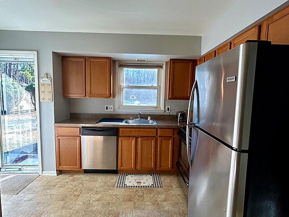 Welcome home to this cute rancher with a paved wrap around driveway and set back from the road surrounded by trees allowing for some privacy. There are 3 good sized bedrooms with new carpet and the primary bedroom features a half bath. There are wood floors throughout the living room, hallway and dining room. The kitchen has a breakfast bar over looking the living room. The basement is partially finished, has a working woodstove and just needs new flooring. The HVAC and water heater are newer. The yard is a clean, blank palate waiting for your imagination to personalize it to meet your needs. Close to shopping and major roadways! Call for your private tour!