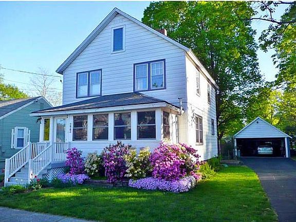 This period house features hardwood floors & beautiful natural woodwork, doors & a built-in glass-fronted china cabinet in the formal dining room. The current owner has preserved the charm of the old features while completing extensive upgrades & energy efficiency enhancements. Over the past 8 years Farnum Cellulose Insulators did extensive insulation work including preparing the walk up attic for conversion to living space. The south facing, enclosed porch received a major facelift with all new windows, hardwood and attractive bluestone entry flooring and the installation of a pellet stove to supplement the oil furnace. The roof was re-shingled & the garage door was replaced. Extensive landscaping compliments the house improvements. Stone paths, flower beds & plantings, a goldfish pond, a solar powered water fountain & a raised wooden deck terrace deck offer a wonderful back yard. Two massive specimen maples support a hammock that completes the scene. Don't wait!