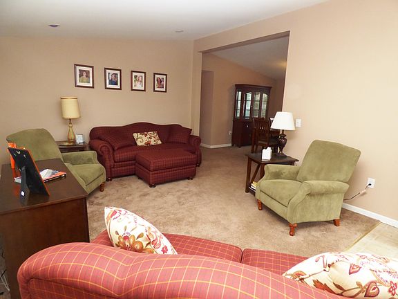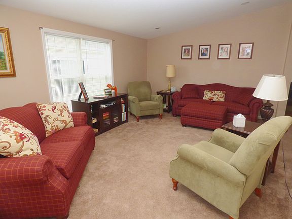 Meticulous, upgraded 2 bedroom, 2 bath Shrewsbury model home which backs to a private wooded area. This home features white cabinetry throughout with beautiful Corian counter tops. You'll get a full appliance package, gas self-clean range, built-in microwave, dishwasher, garbage disposal, washer/dryer and blinds throughout. It has both a composite deck out front and double patio out back. The 14 x 28 garage will not only fit your car but plenty of storage items as well. There is modern neutral colors and neutral carpeting throughout to match anyone's decor. As if that wasn't enough, there is also a sprinkler system to keep the grass plush and green all summer long. This one will not last long. Come see it today!