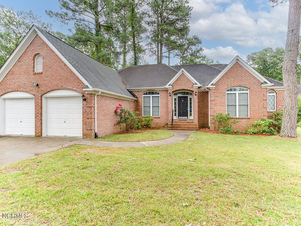 Experience the best of Albemarle Plantation in this charming brick ranch in the Fairview neighborhood. Three bedrooms, two baths, separate laundry room and 2-car attached garage. Living room has a beautiful fireplace and is open to the kitchen and breakfast nook. Formal dining space plus separate office/den space that could be used as a fourth bedroom. Primary suite with large walk-in closet and huge private bath with jetted tub, separate walk-in shower, and dual sinks. The large deck (with access from the living room and primary bedroom) overlooks a private natural area. NEW ROOF November 2023. Lovely gated community with marina, pool, golf course, tennis courts, and clubhouse restaurant.