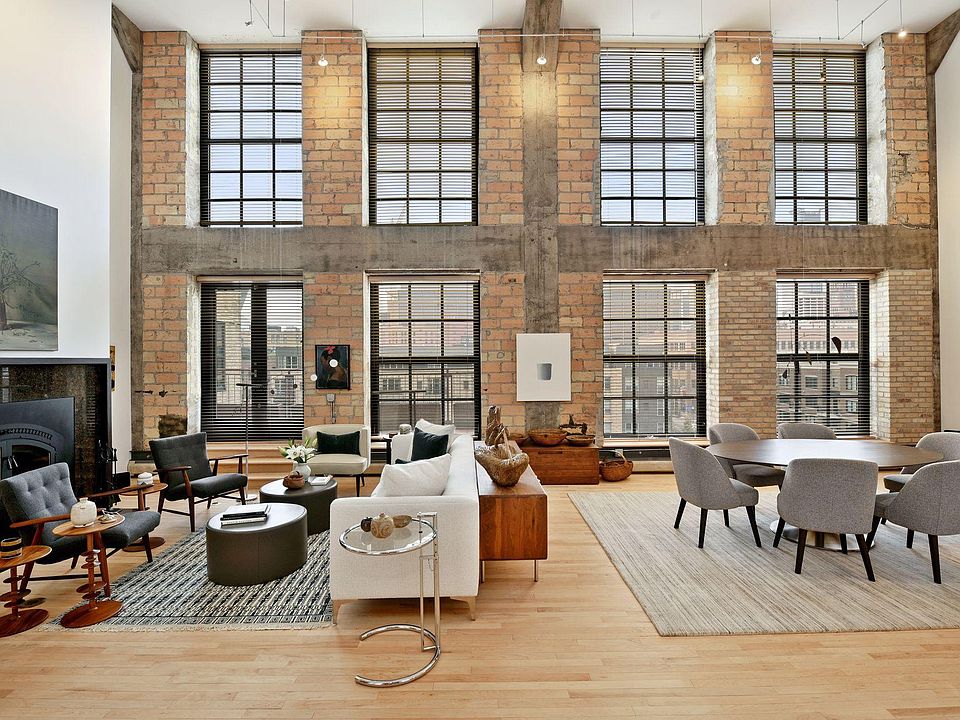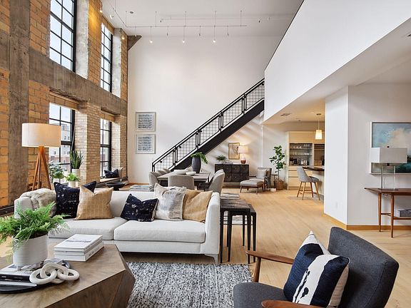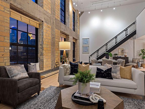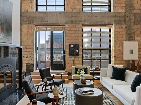 Breathtaking penthouse at the historic North Star Lofts. A 36-unit boutique condo with some of the best rooftop views of both the Mpls skyline and Mississippi River in the entire city! Stroll across the Stone Arch Bridge and gaze at Saint Anthony Falls. Walk to restaurants, shops, sport venues, and theaters. This extraordinary home offers convenient one level living. An impressive 20' ceiling and wall of windows capture city skyline views and abundant natural light. Wood fireplace. Hardwood floors. Designer center-island kitchen. Spacious owner suite with walk-in closet, spa-like bath, and large laundry room. Generous den with built-in library and office area. A dramatic staircase leads to a mezzanine level lounge area and home office overlooking the main level. Separate second bedroom suite. Enjoy direct access to a fabulous rooftop deck and your own private rooftop cabana for grilling, relaxing outdoors, and taking in spectacular river views! 4-car parking with EV charger.