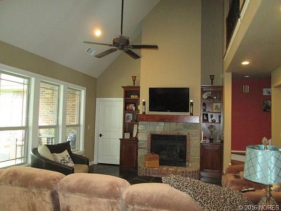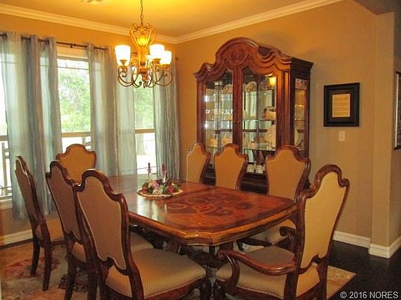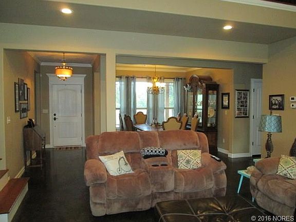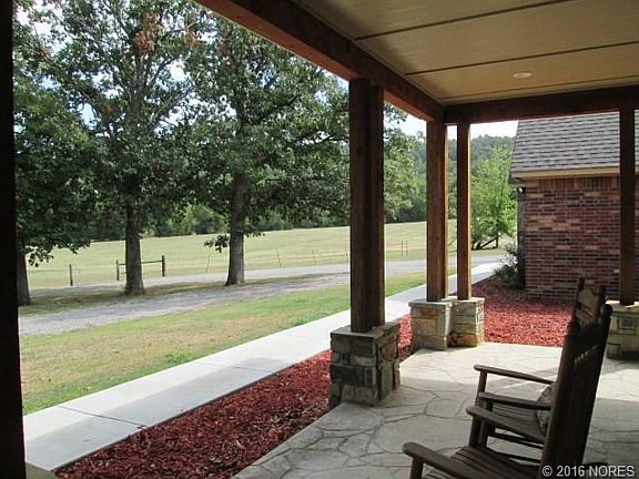 20 fenced acres, 2 ponds, custom one owner home. Geothermal heating and air. Located between Fort Gibson and Tahlequah, Ok Home has open living area with gas log fireplace, formal dining, kitchen with breakfast nook and granite countertops, oversized island & breakfast bar, pantry, coffee bar, heated stained concrete floors. Den is upstairs, safe room in garage floor