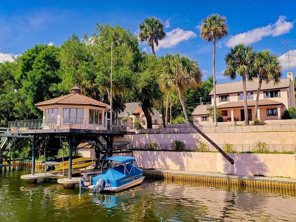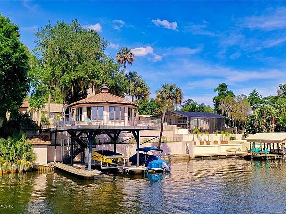 Beautiful Mediterranean style home situated on the St. Johns River facing majestic sunsets. Enter the courtyard thru the wrought iron gates complete with a pergola and enclosed seating area. Enjoy the wood burning fireplace while over looking the water from the sunk in living room. The kitchen has tiled counter tops with upgraded appliances and dinning area with entry from the 2 car garage. Upstairs has 3 including the master suite and a guest bath. The third floor would make a great office space or 4th non-conforming bedroom. Outback park your boat in the lift underneath the large gazebo over the water. The bulk head/retaining walls are all concrete and the framing is all steel. This home is a must see!!!!!