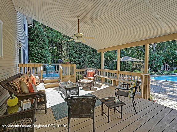 Located in the heart of Manalapan Township, this most desirable 5 bedroom, 2 1/2 bath ''Princeton'' model is perfect for entertaining. Formal L/R is open into the F/R with custom built ins & gas F/P. The newer kitchen includes cherry cabinets, S/S appliances, granite counter top & tile backsplash. The breakfast nook offers a lovely view of the SPECTACULAR backyard w/3 tiered covered porch, skylight, an in ground heated pool w/paver patio & still plenty of room to play. Office/ Bedroom on the 1st flr. MB has hardwood flrs under carpet, WIC & spa bath w/jacuzzi tub. Spacious bedrooms upstairs. Updated bath. Other highlights include hardwood floors through out, custom decorative moldings, recessed lighting & whole house generator. Don't miss your chance to make this amazing home yours!