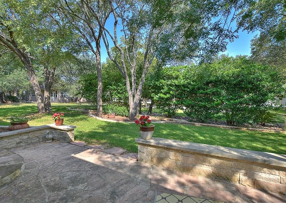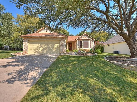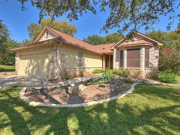 Adjacent to a ribbon of greenbelt, this delightful Sun City Texas Angelina is flush with upgrades including the glass block side light window at the Foyer, where the timeless look of quarry tile begins with porcelain tile blanketing the living areas. A fun gas-log Fireplace charms the Great Room, where custom built-ins will house your flat screen. More superb built-ins treat the Kitchen, where glass-front cabinets and fresh stainless steel appliances add current appeal. High transom windows provide natural lighting at the Kitchen and the Breakfast Room, where large windows view the scenic and very private back yard setting. Those same awesome views are best enjoyed at the Extended Sun Room, where exposed aggregate adds texture and lasting beauty, Quietly separated from the enlarge Guest Bedroom, the Primary Bedroom touts a bay-windowed seating area as well as an updated en suite Bath with Walk-In Closet. Another bay window enlarges the Guest Bedroom adjacent to the Guest Bath. Meanwhile, custom cabinets and folding area upgrade the Laundry with easy access to the Extended Garage. With its nine-foot ceilings rimmed with crown molding and its siperb location near top-notch amenities, this remarkable home is one to see and savor.