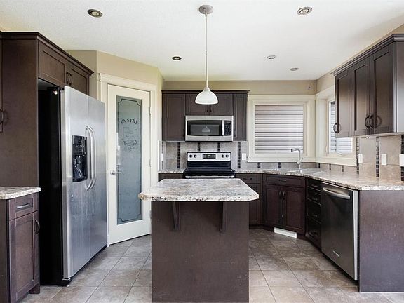 Bright open floor planDark cabinetsCorner pantryEat-up barTwo-tiered deckFully fenced backyardMain floor laundry