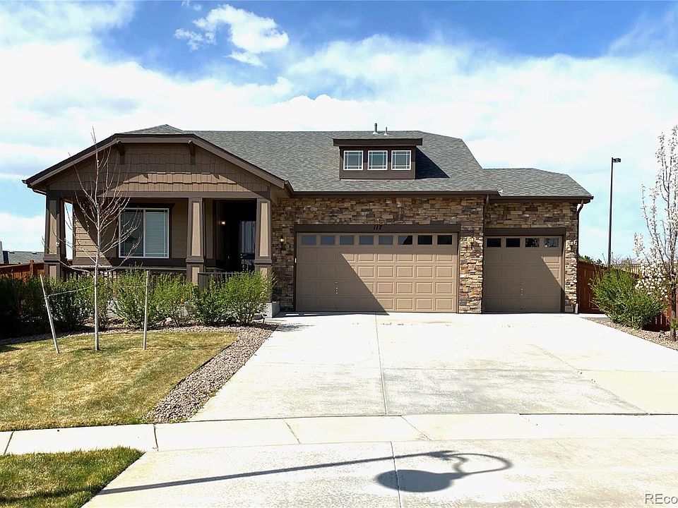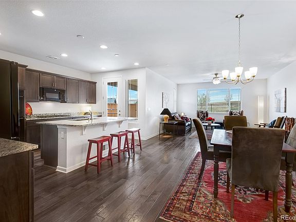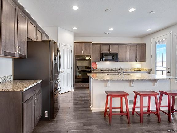 Beautiful big ranch home loaded with premium upgrades in an open floorplan and fully finished basement. This home offers one level living, but has an extra floor of living space in the basement. The sellers thoughtfully selected every finish, including 9ft ceilings on both the main and basement floors, premium Hornbeam Hickory hardwoods, upgraded tile and Stainmaster carpet. They added a large gourmet kitchen featuring premium cabinets, a breakfast island, double ovens, gas cooktop and a sizable pantry, plus a deluxe owner's bathroom including soaking tub, oversize shower and generous walk in closet. 4 bedrooms plus the french door office on the main level provide plenty of spaces for remote workers and learners, room for a home gym, guest space. Enjoy storage and bonus closets throughout this home. Oversize 3 car garage with 8ft doors, oversize driveway for bonus parking, and a large private lot with the extended covered patio. Just 2 blocks to Traditions Neighborhood Park, plus enjoy the community pool and clubhouse. Minutes to Buckley Air Force Base, the Aurora Sports Park, City Center North shopping and restaurants, Murphy Creek Golf Course, quick commuter access to 470 or 6th! Buyer Home Warranty included on this 2017 home that's been lovingly maintained and cared for. Showings start Thursday May 5th, be sure you see this one!