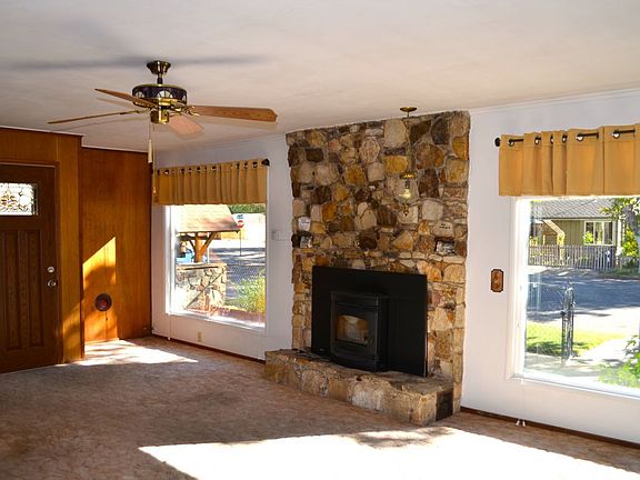 Very charming with custom rock work inside and out. Newer large double pane windows let in lots of natural light. Beautiful rock fireplace with pellet stove insert and new central heating and refrigerated air keep the temperature just right. Open floor plan and entertainer's covered patio area set the stage for family gatherings. Kitchen has upgraded appliances, laminate flooring and nice breakfast bar overlooking the dining room and into the living room. On the side there is a wet bar and a convenient laundry area with washer and dryer included. Very comfortable place. Off street parking for several vehicles or lots of toys. Fully enclosed work shop area. Completely fenced property with drive through gates on each end. Move in ready and priced to sell.