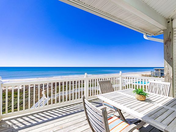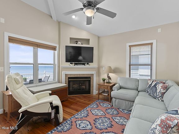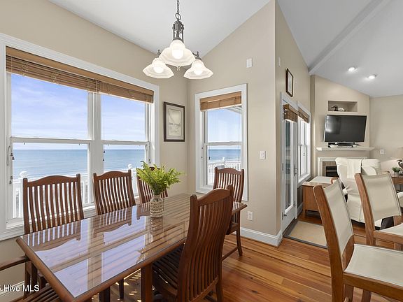 This stunning third-floor oceanfront condo offers breathtaking views and a spacious, open floor plan. Featuring two bedrooms, flex room and two updated baths with elegant tile showers and glass enclosures, this condo would make a perfect second home or investment property. Beautiful hardwood floors flow throughout, enhancing the warm and inviting atmosphere. The living area boasts vaulted ceilings, a cozy gas fireplace and direct access to a private deck, where you can take in sweeping ocean and pool views. The kitchen is equipped with classic white cabinetry and durable Corian countertops, seamlessly connecting to the oceanfront dining area. The porch entry provides glimpses of the sound and Crystal Coast Golf Course. With easy access to the pool and shoreline, this condo offers the ultimate coastal lifestyle. Shutters at Seacrest offers private beach access, community pool and elevator.