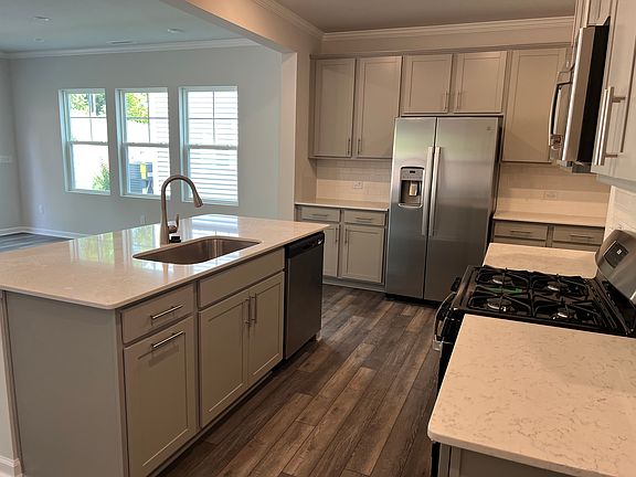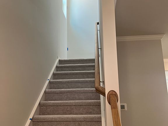 The main level boasts an open layout, including a great room, dining area, and kitchen with white cabinets, quartz countertops, and ample storage. Upstairs, you'll find a spacious primary suite with a walk-in closet, attached bathroom, two additional bedrooms, and a convenient laundry room with a sink.