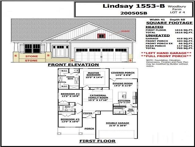 The Lindsay B plan features 1616 sq. ft. with 3 bedrooms, 2 full baths and a double car garage. Open concept family room, kitchen and dining room. Cathedral ceilings in family room. His and Hers walk-in closet with double vanities in the master bath. Covered back porch. Located in Sanford. Close driving distance to Cary or Fayetteville.
