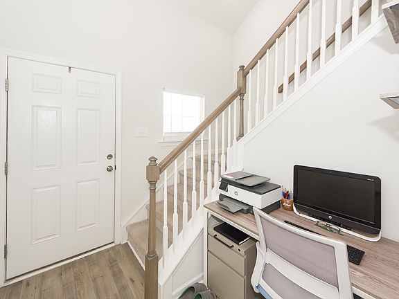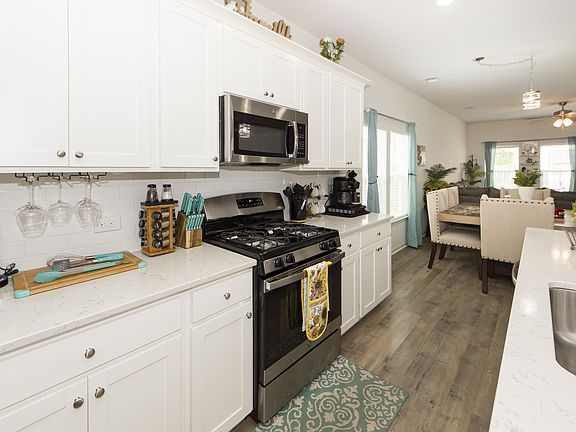 The Russell floor plan provides the benefit of one story living and having a private area upstairs. The home includes 4 bedrooms, 3 full baths and a bonus room upstairs. As you enter the foyer, their are stairs that lead you to a private suite with bedroom, bath and bonus room. Downstairs you enter into a beautiful kitchen with a large island perfect for seating and prep area. The kitchen includes white cabinets with crown molding, knobs, quartz counter tops and stainless steele appliances.You then transition into the dining area which is open to the family room with laminate flooring. The two secondary bedrooms share a full bath and owner's suite has a tub and separate shower with double vanity. Tile floors complete bathrooms and laundry room.