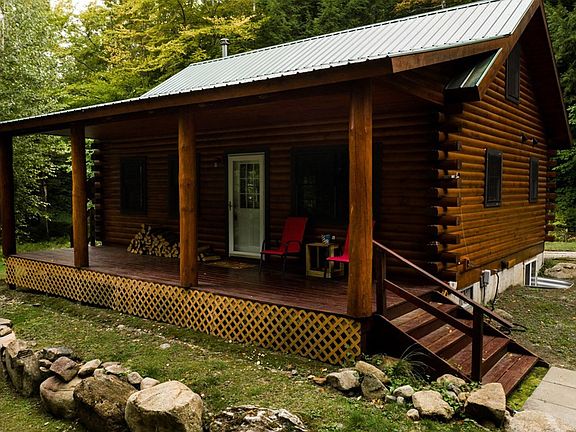 Cabin in the Woods – Real log home on 118+ acres at the foot of Crane Mountain without a neighbor in sight. 2 bedrooms plus sleeping loft, 2 full custom baths with walk in tiled showers, vaulted ceilings, and woodstove in great room. Listen to the babbling brook from the full-length front porch, pole barn for storage, fire pit, trails winding throughout the wooded property. 20 minutes from Gore Mt and close to many hiking trails. Showings by appointment only, no trespassing please.
