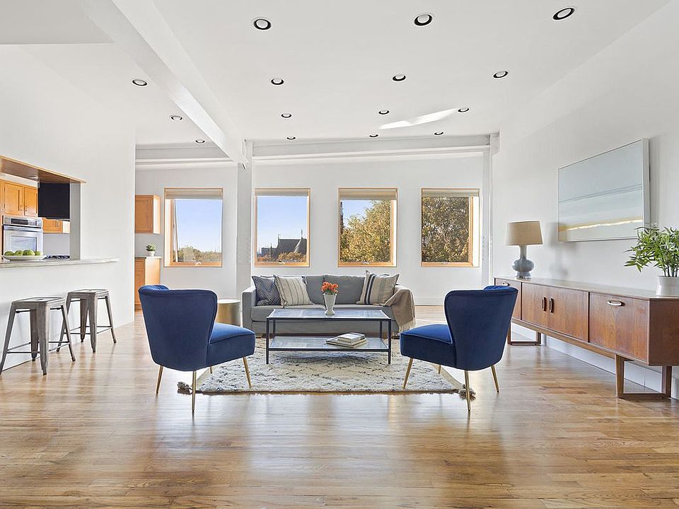 Come see this bright and airy 3 bedroom 2 full bathroom duplex with an amazing private roof deck in prime Park Slope and you'll never want to leave! Here you'll enjoy generous loft-like living space accentuated by sleek steel beams, recessed lighting, hardwood floors, and luxury finishes. Huge windows facing north and west invite in brilliant natural light all day and showcase lovely treetop and open cityscape views. The chic sun-bathed main level offers a gracious open flow for living, dining and entertaining, met by a beautiful windowed kitchen for the cook appointed with wood cabinetry, concrete countertops, and stainless steel appliances. Also on the lower floor are 2 sizable bedrooms with picture windows, extensive closet space, and a huge contemporary full bath with a convenient washer-dryer. Ascend the striking spiral staircase to the upper floor reserved for the incredible master bedroom suite featuring an entire wall of closets, massive windows, and a large, elegant spa-like bath. The piece de resistance is access to the enormous private outdoor rooftop terrace, perfect for lounging, dining alfresco, hosting guests, and tending to your favorite plantings. Situated on a coveted tree-lined, architecturally-rich North Slope block, 117 Sterling Place is a beautifully converted former stable, now an impeccably maintained and managed 18-unit coop. History and character blend with modern allure, at an excellent address a short distance to Barclays Center, Prospect Park, diverse dining, shopping and nightlife options, cultural institutions, and virtually every train line including the LIRR. Pets are allowed too!