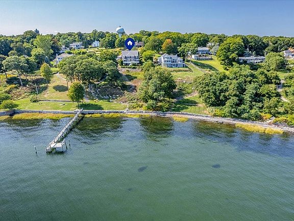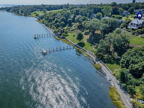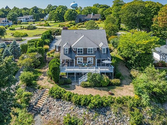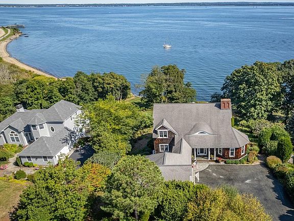 Perfectly set at the end of a cul-de-sac on a private 1.23-acres with about 125 ft. of salt water frontage, this custom-built, shingle-style home offers the best of coastal living. Perched on a knoll, with sweeping water views of Narragansett Bay and the ability to apply for a dock and moorings, the home's entrance is bordered by a stone wall, which opens to a spacious courtyard area and 3-car garage. An eyebrow window above the front door hints at the delightful architectural elements found throughout the house, which masterfully blends beautiful interior and outdoor living spaces. The foyer opens to a unique octagonal library/study with a fireplace, tray ceilings, window seating and beautiful built-in bookshelves and then steps down to a formal living room with fireplace, the dining room and a fabulous entertainment pantry that opens to an expansive eat-in kitchen with a center island and breakfast area. Two screened in porch areas are connected by a large waterfront deck that provides access to the back yard and a winding path to the water. The second floor has a flexible plan with a main bedroom suite/fireplace, spa bath with a tub overlooking the water, shower, closet/dressing room, guest bedrooms and a loft office or additional bedroom area. A 1st floor laundry room, 2 half-baths, a great attic with storage and a walk-out, unfinished lower level that lends itself to a media, work-out or great room complete this amazing property, which doesn't require flood insurance.
