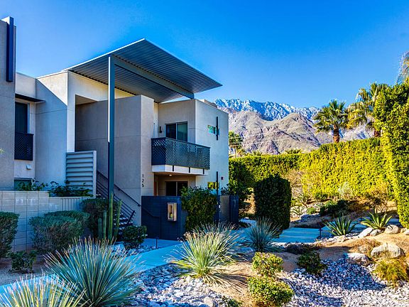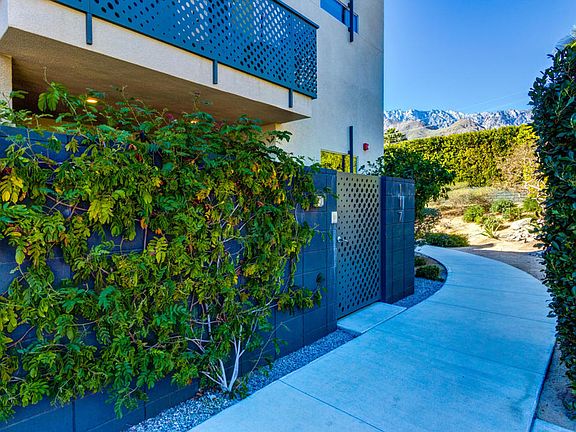 Great mountain views, and a track record of strong seasonal rentals (30 day minimum). This ground floor condo, with an extended patio, features dual primary suites with private baths and walk-in closets, and a hall powder room. This particular unit was one of the original model homes for the developer. Newer construction & private gated community within walking distance of downtown Palm Springs, featuring clean modern design, resort style pool and lounge areas, electric car charging stations, a beautiful community dog park and 360 degree mountain views. This home has high ceilings, fully paid solar (no lease!) low-E glass, tankless water heater, huge interior storage closet, and is wired for home automation. Builder upgrades include upgraded cabinetry, 24x24 designer tile flooring throughout home, upgraded shower tile packages, and Whirlpool appliances. Other upgrades done by the homeowner include ceramic solar film on doors and windows to reduce UV and heat, custom blinds, and barn-style doors at both in-suite bathrooms. This would make a perfect pied-a-terre, permanent home or investment property. Low HOA and you own the land. Call today for a private showing.