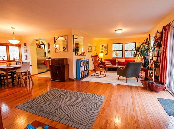 A rare find in Belle Sherman. Enjoy a little solitude above the canopy, listening to a nearby waterfall. 2 levels of awesome decks, perfect for outdoor grilling and summer parties. This 2 bedroom modern nest features open living spaces, updated kitchen, hardwood floors, a huge master bedroom, large bath, 2nd floor laundry.. The lower level family room opens to a secluded patio and hot tub. Next to Six Mile Creek Natural Area -- walk miles of trails! Walk downtown, to Cornell. See Virtual Tour!