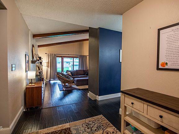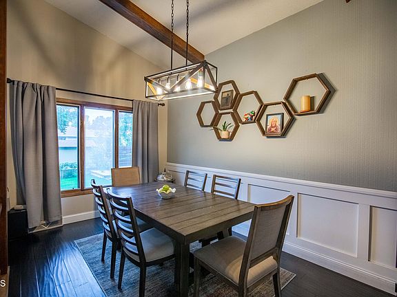 Step inside to find stunning hand-scraped hardwood floors flowing throughout the main level, including a spacious living room with vaulted ceilings, charming wood beams, and a cozy fireplace. The living room opens to an outdoor oasis featuring a pergola-covered patio, lush landscaping, and perennials that encircle the property. A fully fenced backyard with mature trees, grapevines, a large deck, sprinkler system and a handy shed.
