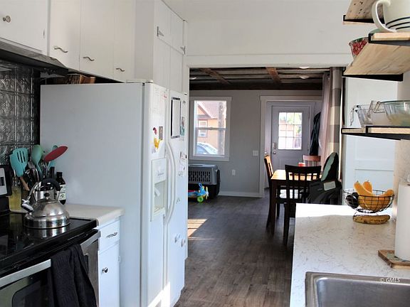 This cozy home with 690 sq feet up and 690 Sq feet down has had many great updates. Starting at the entry, there is new vinyl flooring that continues throughout the main floor. Also on the main floor are two bedrooms, a full updated bath, kitchen and living room/dining room with unique rustic tin ceiling. The lower level has been opened up to have a large family room, also a bedroom, 3/4 bath and laundry utility room. Home has updated lighting throughout, newer windows, cement board siding, a fenced in back yard. heated workshop with updated electrical, newer sewer line and central air conditioning. The homes exterior space is truly maintenance free and ready for a new owner to enjoy.