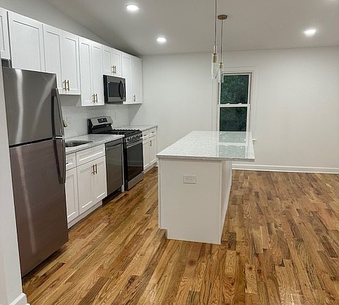 117 W Nicholson is a fully renovated 2 bedroom, 1 bath twin home on an oversized lot with a fully fenced in yard in the heart of the lovely town of Audubon, NJ! This property features brand new hardwood flooring, recessed lighting and is much bigger than it looks. Walk into the house from the front porch and you will be greeted by nearly 10' ceilings, fresh white paint and plenty of natural sunlight. There is 1 bedroom near the front of the house then a large washer/dryer area with brand new washer, brand new dryer and cabinets. Off the washer dryer area is a full bathroom with new tile, new vanity, new lighting and a new tub. There is another bedroom then a nice sized living room which leads into the kitchen. The kitchen features white cabinets, stainless steel appliances, an 8' long center island and quartz counters. This is a great floor plan to entertain. The living room has a staircase that goes to the 2nd floor which is great extra storage space. The ceiling height is only about 6'. It is finished with vinyl flooring. Off the kitchen is a side door which leads to the oversized backyard. The yard is larger than most in town and is fully fenced with 6' white vinyl and backs up to a creek. This home features new central a/c and gas heat. Large unfinished basement. No smoking, 1 year lease. Available immediately. Pets on case by case basis, subject to pet fee. Tenant responsible for all utilities and lawn/snow. Tenant pays for all utilities and is responsible for lawn care/snow removal. Pets allowed on case by case basis, subject to pet fees. 1 year lease.