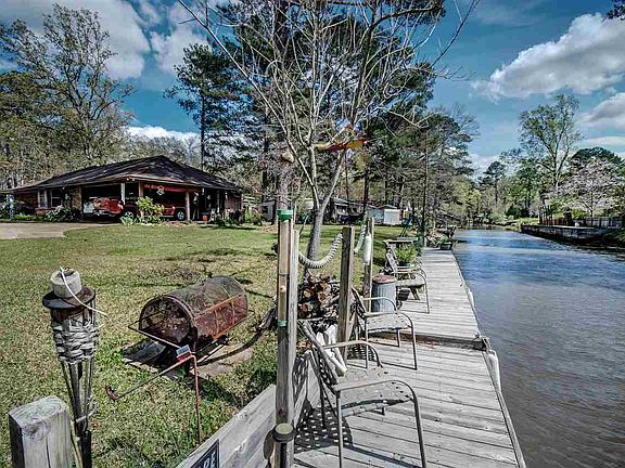 Waterfront! Home with 25' by 16' Double Boat slip! Enjoy the relaxing laid back life style of waterfront living. Fish everyday! Take your boat out for a spin of feed the catfish from your 5 x 65 ft pier. Other wonderful features include over sized great room with huge brick fireplace and remote control gas logs, programmable thermostat, a 12 x 20 wired workshop insulted with A/C, separate greenhouse, metal storage building on concrete slab, , outside fountain remains, sensor lighting system for night, 2 ceiling heaters in master bathroom. Ornate manual iron water pump at left of the pier remains. Property has Jacuzzi water pump to water lawn. DO NOT OPERATE without seller present. ***Antique Phone Booth DOES NOT STAY.