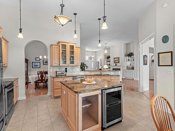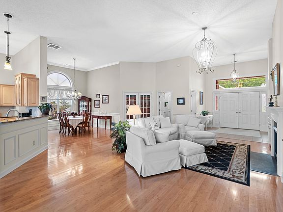 Welcome to this expansive, single-level 3-bedroom, 2-bathroom home, with a 2-car garage designed with contemporary updates and luxurious touches. Upon entering through the double doors, you're greeted by the impressive high ceilings that extend throughout the home, creating an airy and spacious ambiance. The massive living room is a focal point of elegance, featuring custom built-ins with integrated lighting, a cozy gas fireplace with white birch logs, and stunning hardwood floors that add warmth and sophistication to the space. The open-concept kitchen is a chef's dream, boasting custom cabinetry, granite countertops, a work island with a built-in wine cooler, and sleek stainless-steel appliances. While the stove is currently electric, there is a gas connection available for easy conversion. Adjacent to the living room is a versatile office area with French doors, providing privacy for work or relaxation. This space can also serve as a bonus room, man cave, kid cave, or playroom, adapting to your needs. The owner's suite is a tranquil retreat, featuring double tray ceilings and a serene sitting area with views of the peaceful backyard pond. The ensuite bathroom offers a custom tile shower, a soaking tub, and double sinks with granite countertops, ensuring a spa-like experience. The two additional guest bedrooms are generously sized, providing comfort and privacy. The guest bathroom is beautifully appointed with a custom vanity and granite countertop. Enjoy the outdoors from the Carolina room, which overlooks the cobblestone brick patio and beautifully landscaped backyard. The custom landscaping, complete with palm trees, enhances the view of the community pond. The Prince Creek of Linksbrook community offers an array of amenities, including a walk-in saltwater pool, hot tub, clubhouse with a full-size kitchen, tennis courts (also used for pickleball), a workout room, and a picnic area. Experience luxury, comfort, and convenience in this meticulously updated home. Schedule your viewing today to see all that this exceptional property has to offer!