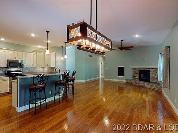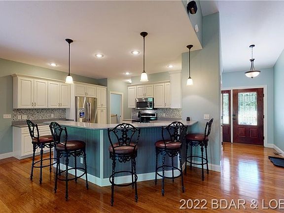 Welcome to this like new home offering an exceptional location w/ seasonal lakeview of the 29mm of the Osage. Upon arrival you will see the meticulous landscaping, flat driveway w/oversized 3 car garage, lower gator garage a 22x30 steel utility bldg. w/concrete floor. Inside, note the gorgeous real hardwood floors w/corner stone fireplace that opens to a wall of windows. The spacious dining area leads out to a screened in deck that sits among the trees & overlooks the firepit area, raised gardens & treehouse. Well designed kitchen offers stainless steel appliances, custom cabinets and pantry. Oversized laundry room has sink and workspace. Main level living featuring 2 bedrms & 2 bathrooms. The master offers his/her closets, double vanity sink & private area for jetted tub & walk-in shower. Lower level offers an awesome family rm for entertainment, wet-bar & 2nd laundry area w/storage, 2 more bedrooms & bathroom. Lower concrete patio area. See attached feature sheet. Close to marinas.