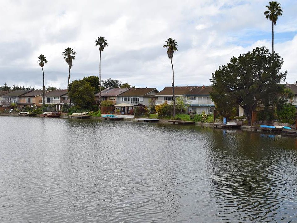 Condo with lagoon view from private balcony. Wood beam ceilings, wall to wall carpet, pool and shared lagoon boat dock, located in Alameda's Gold Coast neighborhood.