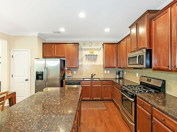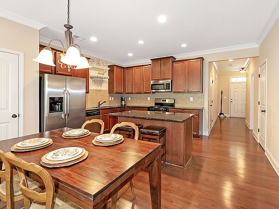 - Kitchen Features: Breakfast Bar, Cabinets Stain, Pantry, View to Family Room, Stone Counters, Kitchen Island, Pantry Walk-In, Breakfast Room