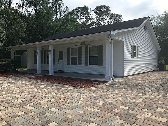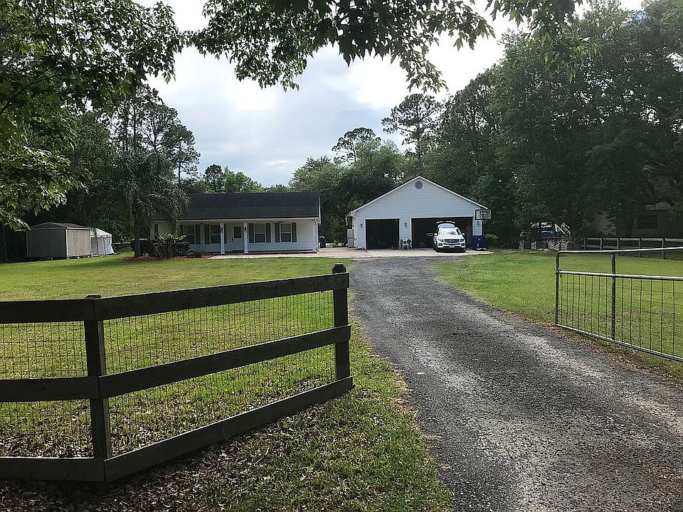 Need room for your boat, trailer, RV, utility vehicles, off road toys and pets? Looking for "A" rated schools? This updated 3/2 cottage style home on 1.47 acres in desirable Northwest St Johns County, fenced with 3+ car detached garage/party barn is perfect for all of that and more! Great front porch sitting and back deck grilling areas ready for entertaining. Featuring a great room floor plan, the open living, dining and kitchen is light and bright with plenty of windows. Upgrades include refinished raised panel kitchen cabinets, new modern laminate kitchen counter tops, ceramic tile flooring in living spaces, hand scraped plank hardwood in master bedroom and 2nd bedroom, laminate wood floor in 3rd bedroom, knockdown ceilings, 5" baseboards, over sized door trim and wired for security system and surround sound in great room and front porch. Master bedroom has built in chest of drawers, walk-in closet, raised height double vanity, jetted tub and upgraded ceramic tile work. Hall bath recently updated with high end porcelain plank style tile floor, tiled walk in shower with frameless sliding glass door and raised height vanity. Plenty of storage on this property. The 3 bay garage is extra deep and has enclosed room perfect for craft room or office or ready to add an outdoor bath. Storage shed or workshop provides more storage solutions for tools and hobbies. Home and garage are low maintenance vinyl sided; well and septic for low utility bills. NO HOA OR CDD fees! Master bedroom approx 15'x11', 2nd bd approx 12'x11', 3rd bd approx 8'4"x10'. One owner has Florida real estate sales license but in referral status, NOT a member of a Realtor board or MLS association. Seller will cooperate with FL licensed brokerage; commission not to exceed 2% of sales price.