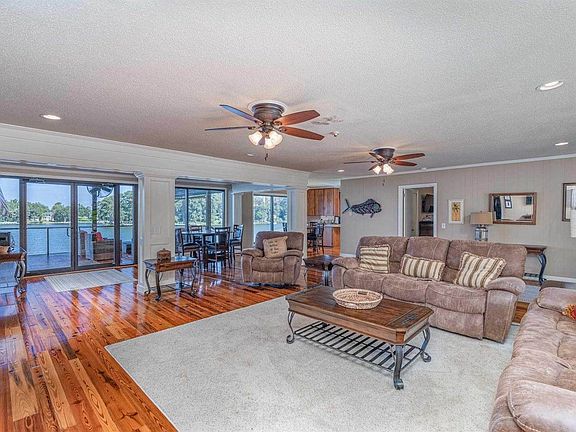 Owning this one of a kind property would be hitting the jackpot! Almost 2 acres is rare but a property with 3 structures is unheard of. The Grandfathered Boat House Condo offers private bedroom, full kitchen with private deck area. Also features an one of a kind Dry storage w/ a winch rail system. The Main house oversized den has beautiful heart pine floors. 2 Master suites and the full Basement has plenty of flex space for additional bedroom office/gym/craft room etc. The outdoor living space with full bar is overlooking bear creek with an unmatched sunset view. The detached 2 garage has a separate bunk room for guests or bonus space! Over 250 ft on the water, 2 Docks, 3 houses, 3 acres, Private setting, Boat House with a sunset view! Who will be the lucky one?